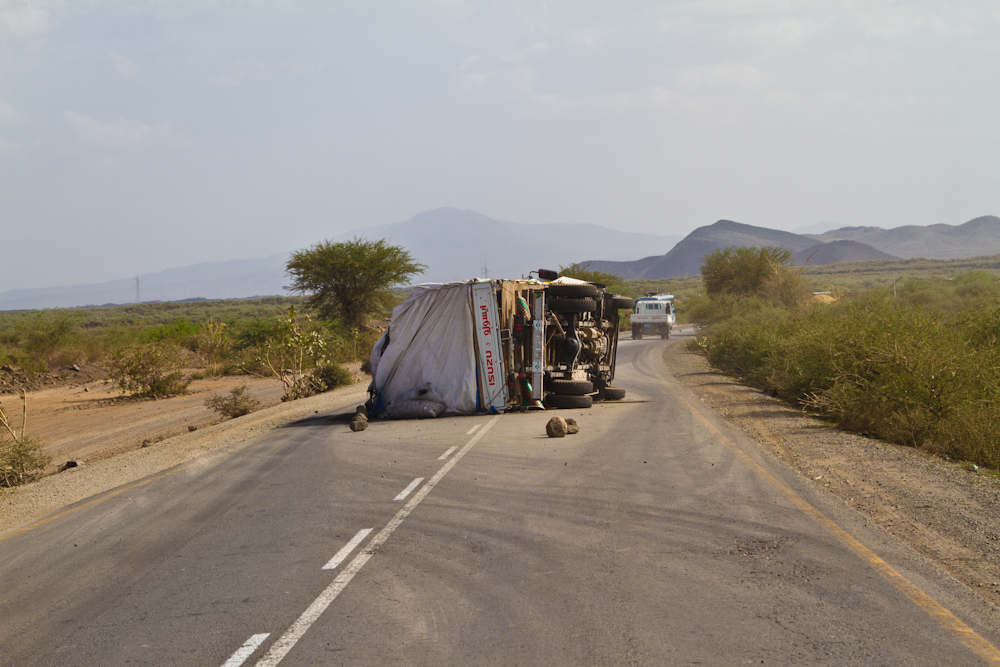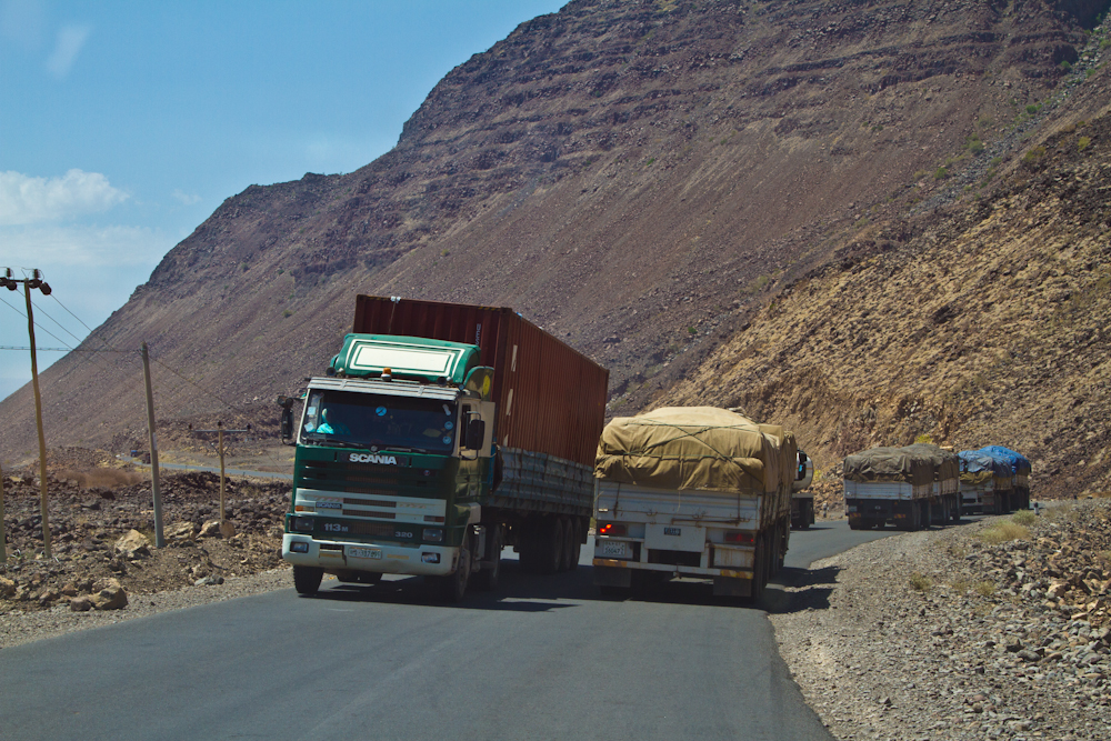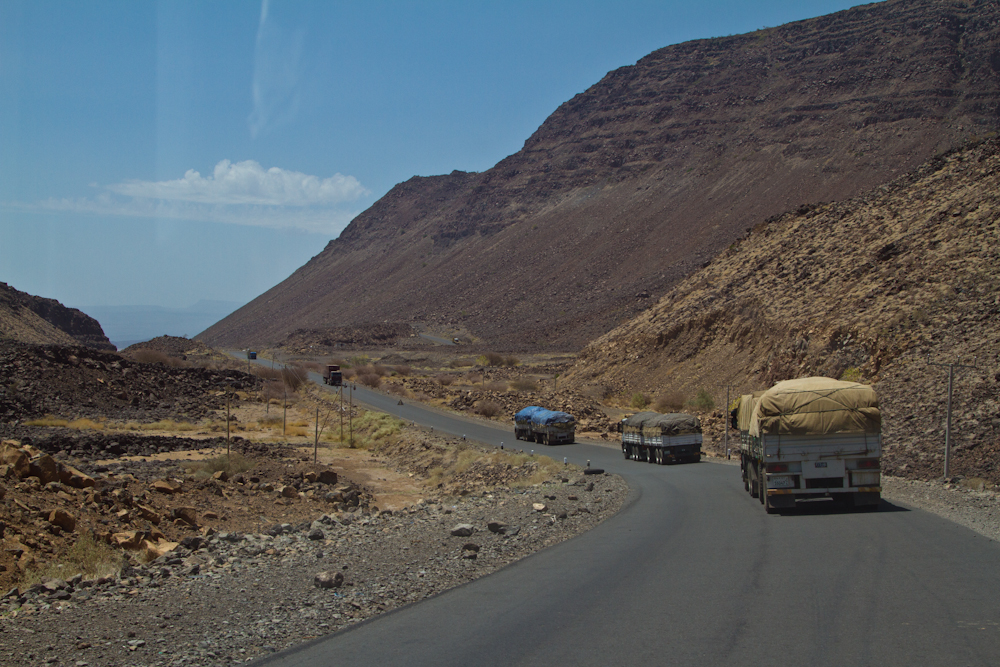 Die Addis-Ababa-Djibouti-Strasse ist die Hauptversorgungslinie für das Binnenland Äthiopien. Jedes Deodorant, jeder Turnschuh und jeder Liter Diesel wird über diese Strasse transportiert. Kurzum alles, was Äthiopien mit seinen knapp 90 Millionen Einwohnern importiert, findet den Weg über diese Strasse. Nebst mir sind deshalb auch vor allem LKWs auf dieser Strecke unterwegs. Auf ein Auto kommen rund 70 bis 80 LKWs, entgegenkommend hauptsächlich mit einem Schiffscontainer oder mit Brennstoffen beladen. In meiner Richtung sind die LKWs meistens leer und nicht wenige machen Huckepack: Ein LKW hat seinen eigenen Anhänger oder aber einen anderen LKW geladen. Es ist beeindruckend zu sehen, wie ein Land über eine einzige Strasse versorgt wird und welche gigantische Logistikindustrie dies mit sich zieht.