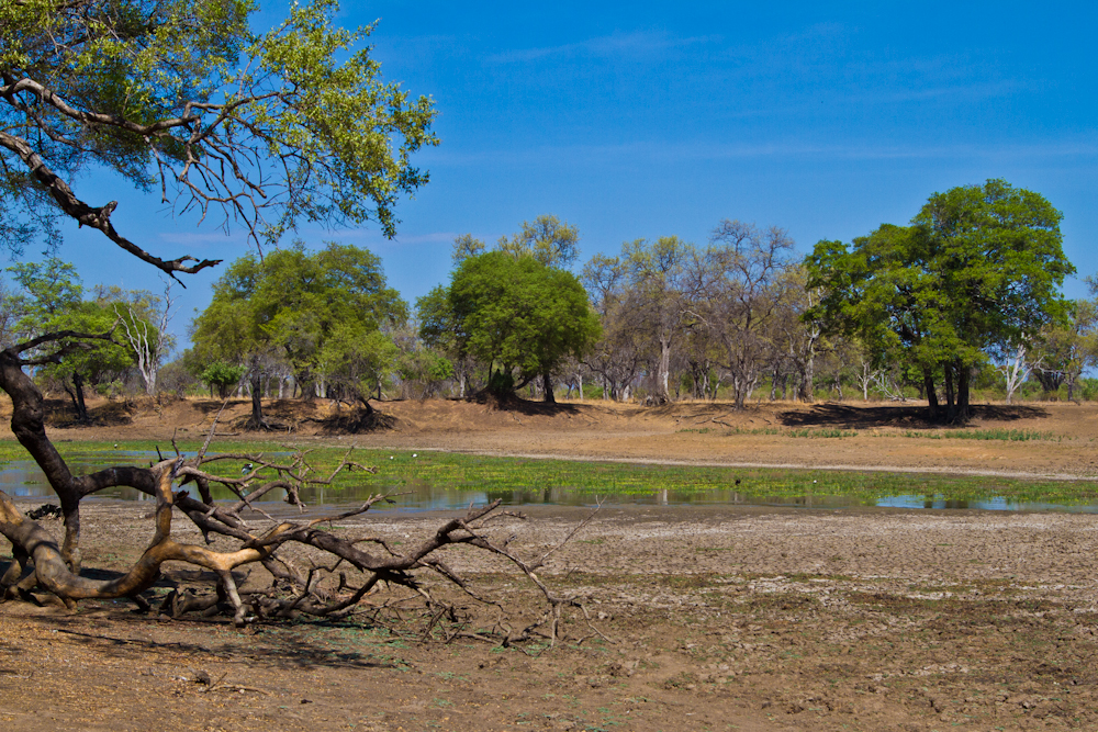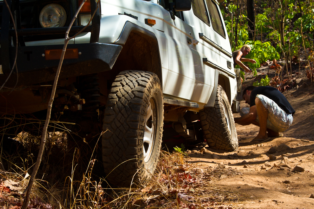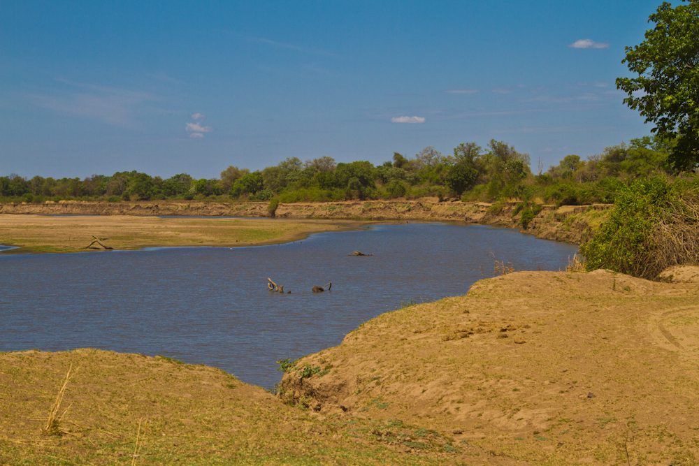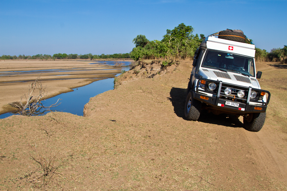 Die nächsten paar Tage verbringen wir im South Luangwa National Park. Mit Tiere beobachten habe ich diesmal Pech und ausser einer Löwin gibt’s nichts Spektakuläres zu sehen. Dafür ist es heiss, sehr heiss sogar. Problemlos knackt die Quecksilbersäule die 40-Grad-Marke am Schatten und an der Sonne sinds nochmals 15 Grad mehr. Die Folgen: 24-Stunden-Schwitzen und ständiger Durst trotz 4-6 Liter trinken pro Tag. Danach geht’s weiter quer durch den Park. Auf abenteuerlichen, selten befahrenen Pisten ans Nordende des South Luangwa, an die Great North Road. Die Piste beginnt harmlos sandig mit 2-3 halbtrockenen Bächen, die zu durchqueren sind. Danach wird’s aber steil und steinig. Auf einem ausgewaschenen Track sind auf rund 10 Kilometer etwa 1000 Höhenmeter zu erklimmen. Wassermelonengrosse Steinbrocken bilden einen treppenartigen Aufstieg. Nun verstehe ich das Hinweisschild am Anfang der Piste mit der einfachen Ansage: Strictly 4×4 only! Im ersten Gang der Untersetzung fahre ich die Treppe hoch, das Taxi kommt an seine Grenzen. Aber alles geht gut. Bis zu dem einen grossen Stein, über den ich mit dem rechten Hinterrad abrutsche. Im nächsten Moment schlägts mir das Lenkrad aus der Hand, das Taxi macht einen Satz und sitzt neben der Strasse. Ein Rad ist noch auf der Strasse, eins im Gebüsch, eins im Strassengraben eingeklemmt und eins in der Luft. Es geht weder vorwärts noch rückwärts. Zum Glück sind meine deutschen Freunde noch mit mir und gemeinsam gelingt es uns, mithilfe von Hijack und einer Sandblech-Brücke über den Strassengraben, das Taxi wieder auf die Strasse zu bringen.
