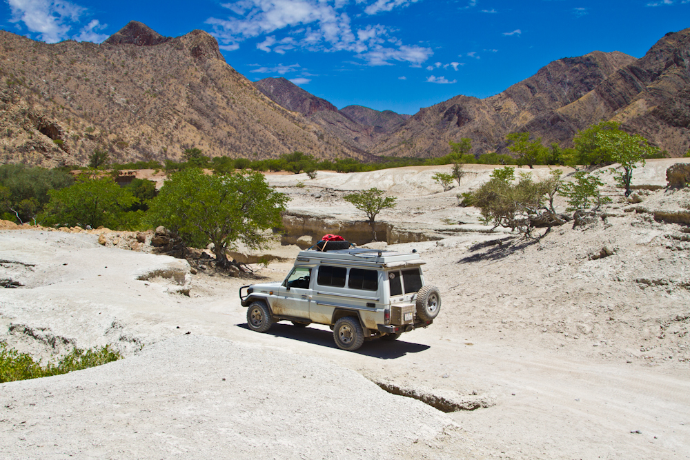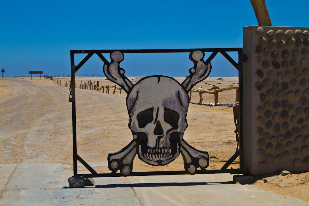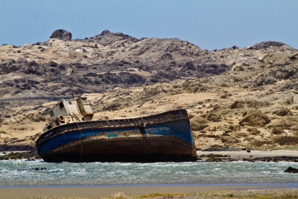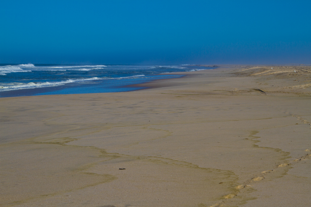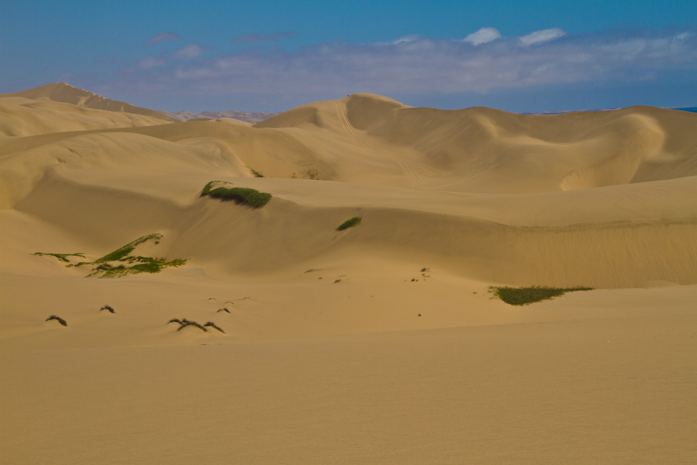 Meine weitere Route führt mich Richtung Südwesten. Das erste Mal seit Dar es Salaam in Tanzania geht’s wieder ans Meer, diesmal an den Atlantik. Mit der Fahrt Richtung Meer wird die sowieso schon spärlich bewachsene Steppe noch karger und auf den letzten einhundert Kilometern vor der Küste wächst gar nichts mehr. Erst ist die Landschaft noch steinig-bergig, danach gehört sie ganz den Sanddünen. Bereits weit vor Erreichen der Küste werden die Sinne getäuscht. Immer hat man das Gefühl, in höchstens ein bis zwei Kilometern sei das Meer erreicht. Man kann das Blau sehen und sogar die Umrisse der Brandung, bis sich beim Näherkommen alles als sandige Illusion entpuppt. Ohne die Hilfe des GPS, welches die tatsächliche Entfernung des Meeres verrät, würde man unweigerlich auf diese Fata Morgana hereinfallen.