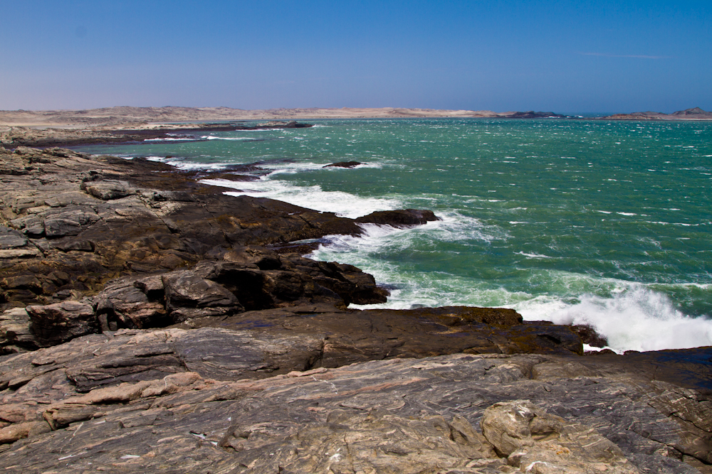 Dann ist der Atlantik erreicht. Aber es ist nicht dasselbe Meer wie noch in Ostafrika. Dieses hier ist wild und eiskalt. Meterhoch sind die Wellen, die Wassertemperatur beträgt gerade mal 12 Grad und sorgt für ein eisiges Klima. Trotz brütender Sonne ist es nachmittags nur 17 Grad warm. Vor zwei Stunden warens noch 20 Grad mehr. Ich friere. Zum ersten Mal seit dem Besuch der Simien-Mountains in Äthiopien ziehe ich nach Sonnenuntergang Pullover, Faserpelz und Winterdaunenjacke an. Die steinsandige Wüstenlandschaft ohne einen einzigen Grashalm, das wildtosende Meer, der ständig wehende kalte Wind und die niedrigen Temperaturen, dazu eine Campsite mit dem Charme einer Polarforschungsstation, lassen einen das Gefühl haben, man halte sich eher bei 70 Grad nördlicher Breite denn bei 22 Grad südlicher auf.